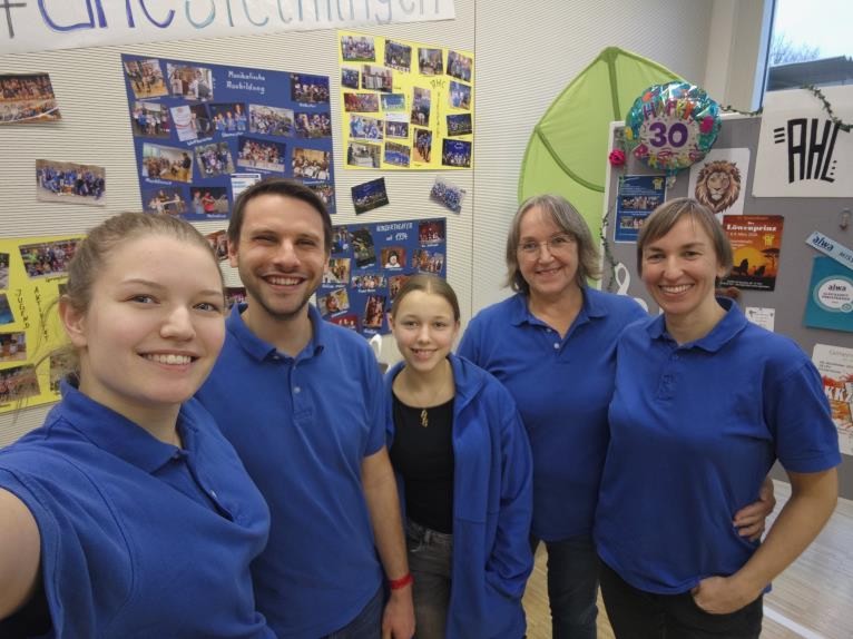 Ein Teil der Schauspieler vom 30. Kindertheaterstück des AHCs dankt Optik Scheurenbrand für die Unterstützung